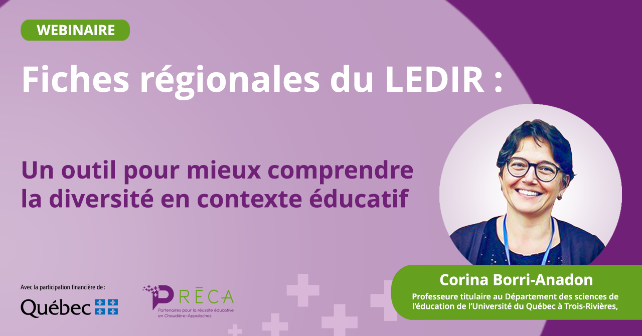 Webinaire | Ce webinaire met en lumière la région de Chaudière-Appalaches à travers le prisme de la diversité. Animé par Corina Borri-Anadon, professeure titulaire au Département des sciences de l’éducation de l’UQTR et directrice du Laboratoire éducation et diversité en région (LEDIR), il propose une réflexion autour des multiples facettes de la diversité et des initiatives innovantes mises en place dans les établissements scolaires.