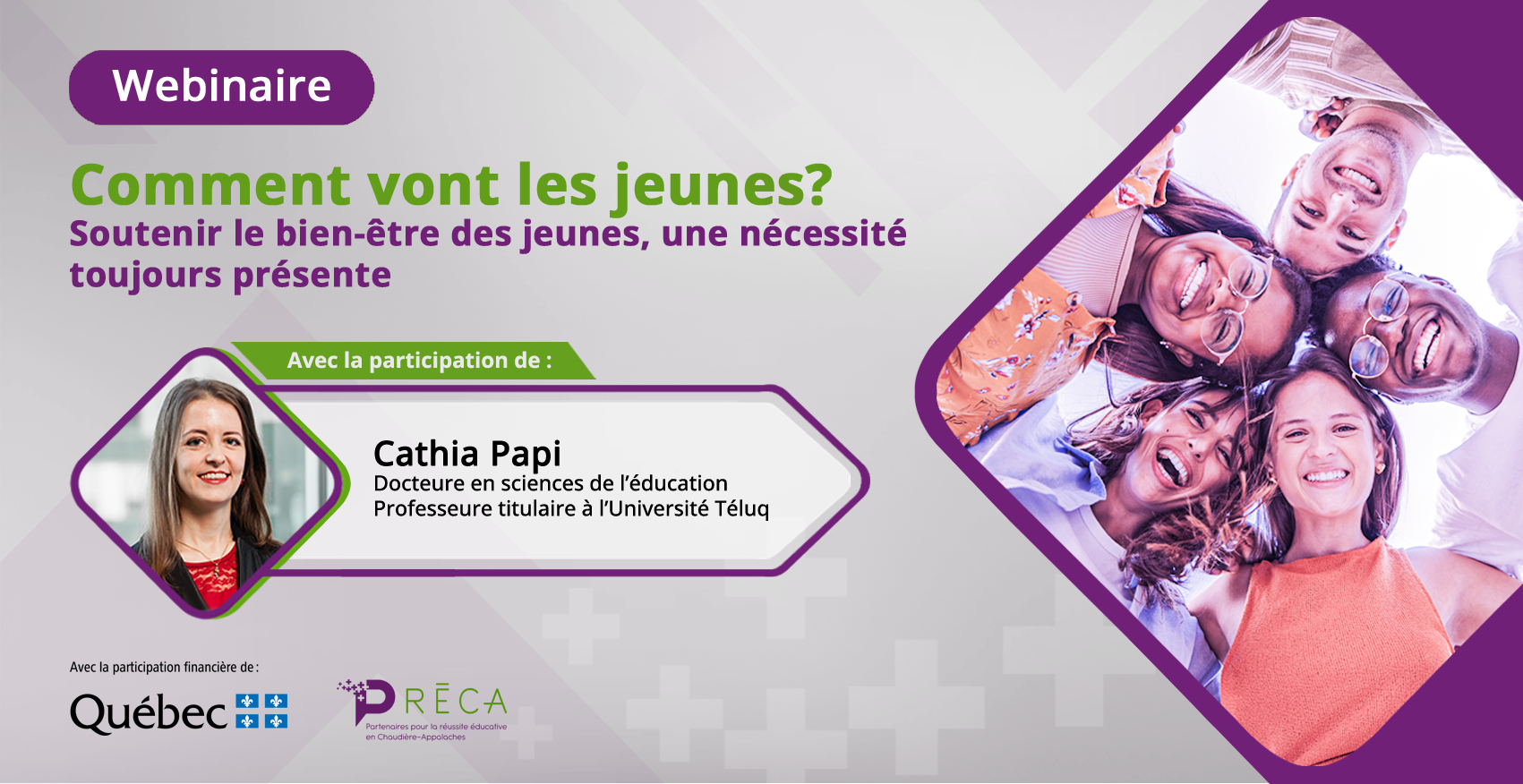 Webinaire | Les jeunes au Québec sont confrontés à des défis majeurs qui influencent leur santé mentale, leur comportement et leur parcours scolaire. Prenons un moment ensemble afin de prendre du recul et analyser ces enjeux, tout en explorant les facteurs qui compromettent leur bien-être, en particulier dans le contexte post-crise sanitaire. Cathia Papi, docteure en sciences de l'éducation et professeure à l'Université Téluq, présente un état des lieux du retour en classe intégral de nos jeunes après la pandémie.