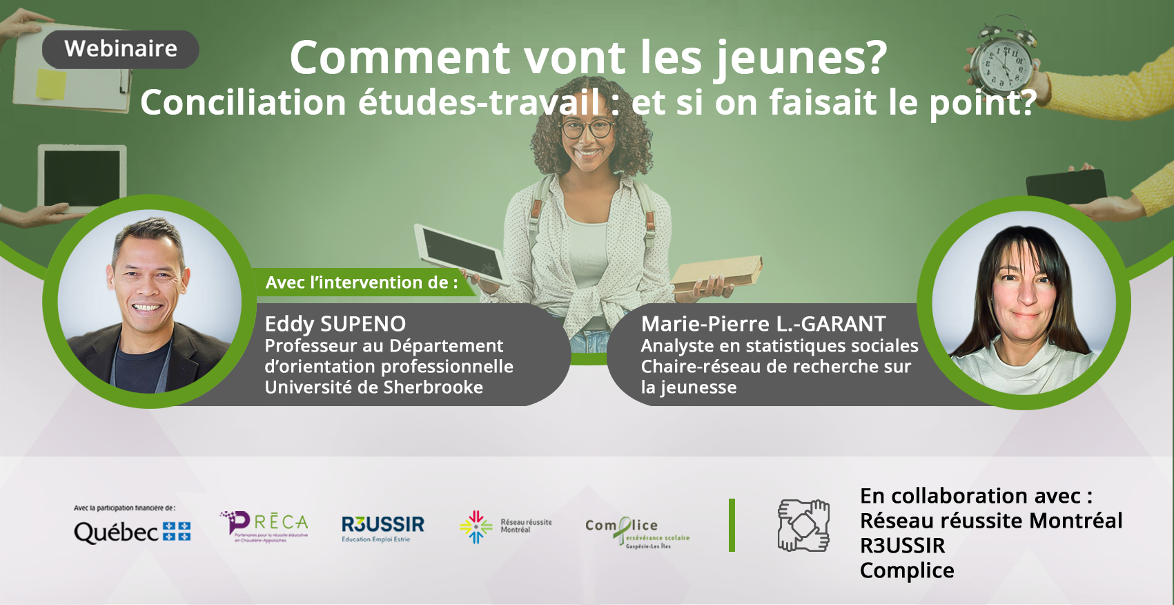 Webinaire | Rediffusion du webinaire « Comment vont les jeunes? Conciliation études-travail : et si on faisait le point? », qui aborde les principaux enjeux liés à la conciliation études-travail chez les jeunes.