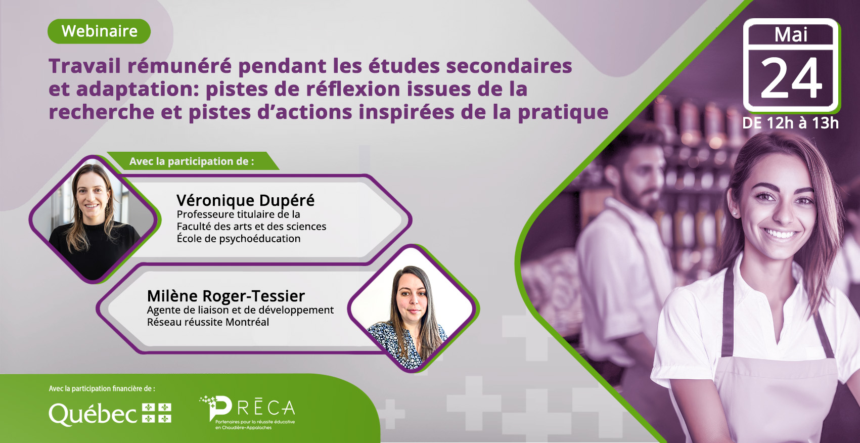 Webinaire | Webinaire avec Mme Véronique Dupéré, professeure à l’École de psychoéducation de l’Université de Montréal,qui aborde quelques situations de vie (p. ex., en lien avec la vie familiale, la santé ou la vie sociale) qui, lorsqu’elles émergent à la fin du secondaire, peuvent pousser des élèves à abandonner.