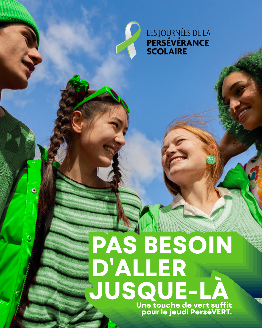 Cette couleur est associée au blanc, symbolisant la contribution de la communauté au développement des jeunes, et est mise en valeur lors du Jeudi PerséVERT. Le jeudi 19 février, on met le VERT à l’honneur en signe d’adhésion à l’importance de la persévérance scolaire. C’est facile et tout le monde peut participer!