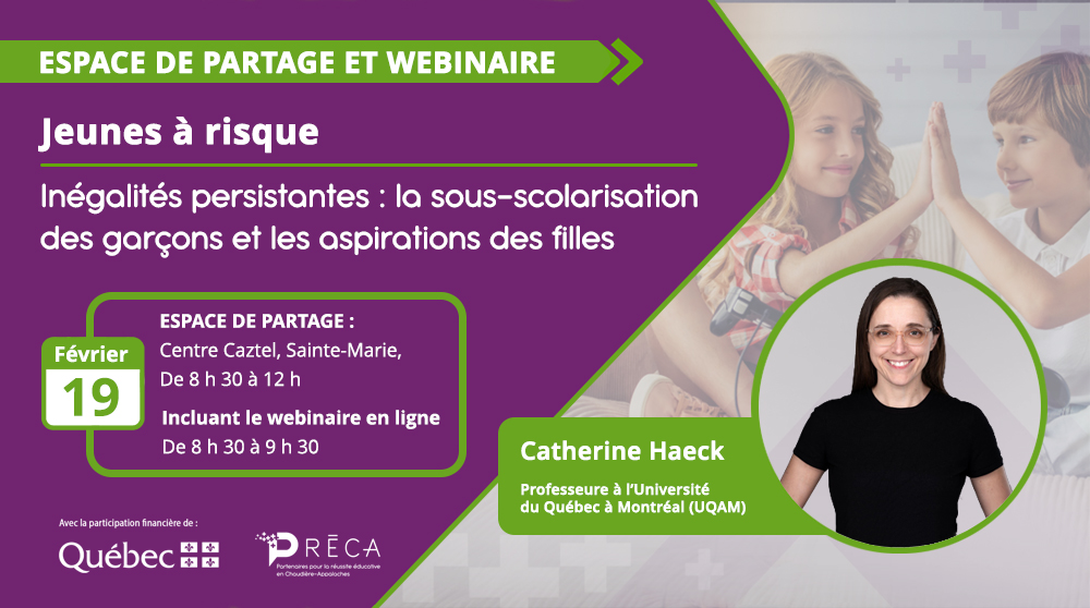 PRÉCA vous convie à un moment de réflexion et d’échanges autour d’un enjeu actuel : la sous-scolarisation des garçons et les aspirations des filles. Un événement en deux volets vous attend, en compagnie de Catherine Haeck, professeure titulaire en sciences économiques à l’UQAM et spécialiste en économie de l’éducation.